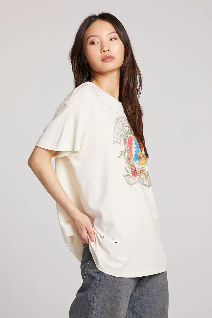 A beautiful bouquet frames the classic floral design, inspired by old school tour tees.